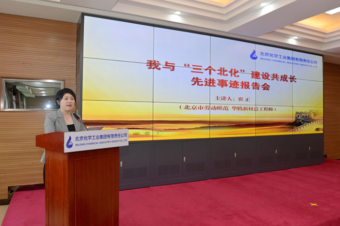 在先进事迹报告环节,市劳动模范,华腾新材总工程师崔正携《以使命为船,以热爱为帆,在时代洪流中奋勇争先》;市模范集体代表,试剂所总经理助理、质量检验部部长孟宪冬以《传承工匠精神,助力“三个北化”,试剂所质量检验部的奋进之路》为题,围绕个人成长、科研开发、团队建设,自信讲述与北京化工共同成长的点点滴滴。