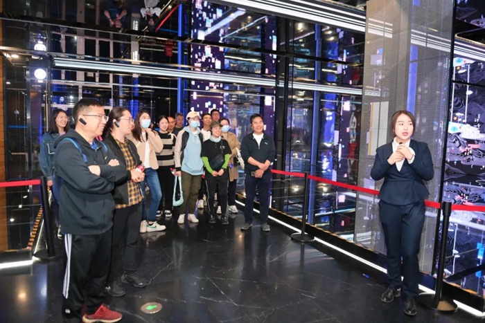 在讲解员的引导下,参观的同志们认真聆听、亲身感受森林书苑、元宇宙体验馆、古典文献馆、艺术文献馆等区域的设计理念,全视角观摩智能化立体书库为读者提供的便捷、高效的服务,沉浸式体验“数智赋能”“AI+图书馆”的跨界融合新模式。